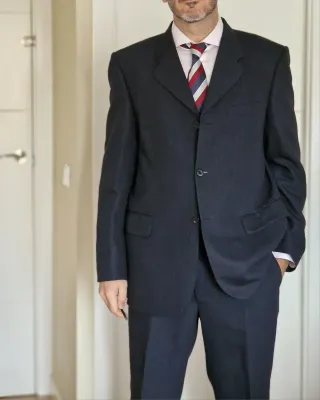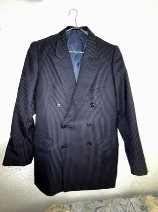 Traje vintage de lana virgen 100% con un diseño de raya clásica. - Tejido: 100% Lana Virgen. - Diseño: Raya. - Color: Azul Marino.