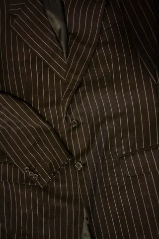 Traje de chaqueta con un diseño de rayas verticales en tonos marrones y rojos. Ideal para ocasiones formales o para añadir un toque distintivo a tu vestuario. - Chaqueta de corte clásico. - Patrón de rayas verticales.