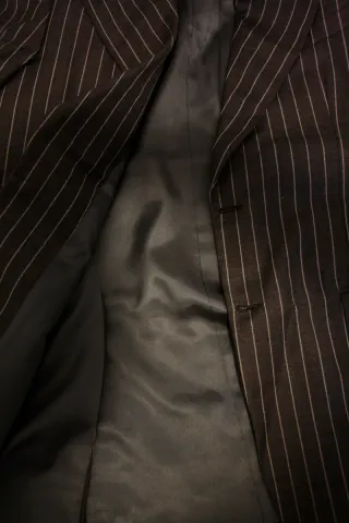 Americana de vestir con un diseño clásico de rayas verticales. El forro interior es de un tono dorado que contrasta con el exterior. - Americana de rayas. - Forro interior dorado.