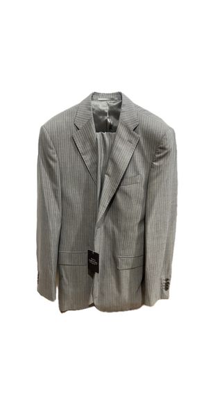 Elegante americana de la prestigiosa marca Loro Piana. - Diseño clásico con rayas verticales. - Color gris versátil. - Ideal para ocasiones formales y eventos especiales.