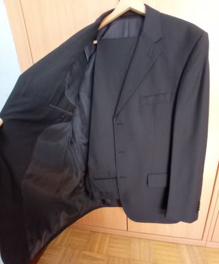 Vendo traje (Americana + pantalón)color negro y raya diplomática. Comprado en El Corte Inglés. Muy poco uso. Excelente estado Talla 48.