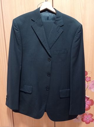 Traje pantalón y chaqueta azul oscuro con rayas. Talla L. Usado solo una vez.