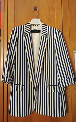Americana de estilo clásico con un diseño de rayas verticales. En perfecto estado, poco uso. Etiqueta interior pone M pero da poco talla, sería más bien una S. 100% algodón - Cierre de un botón. - Dos bolsillos delanteros con solapa. - Puños con tres botones.