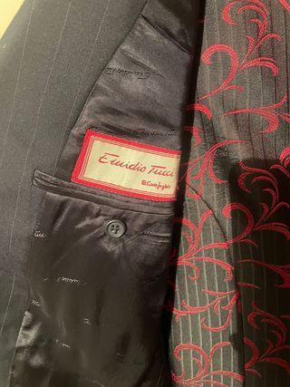 Traje clásico Stefano Rossi azul marino con raya diplomática. Puesto solo una vez. 60% lana virgen 40% poliéster Americana cruzada: - Hombros 48cm - Largo 77cm - Mangas 62cm Pantalón recto: - Cintura 47cm (contorno cintura 94cm) - Largo 110cm - Largo desde tiro 80cm - Pata 23cm