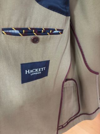 Americana de paño en color camel de la marca Hackett. - Bolsillo interior con detalle de ribete a rayas. - Botón de cierre. - Forro interior de satén azul marino.