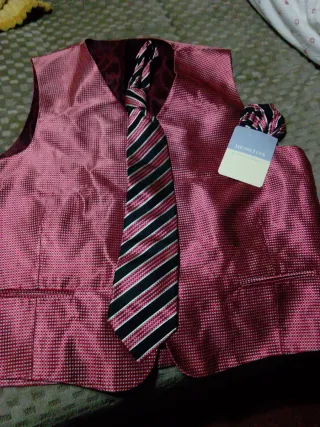 Conjunto de chaleco y corbata de la marca BESSTON. - Chaleco de color rosa con textura. - Corbata a rayas en tonos rosa, negro y blanco. - Pañuelo a juego con el mismo estampado que la corbata.