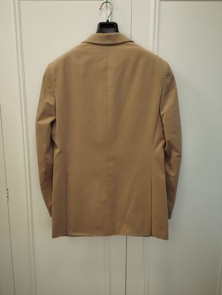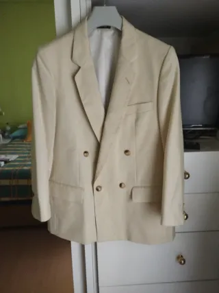 Americana de caballero en color beige. Un clásico para cualquier armario. - Doble abotonadura. - Bolsillos frontales. - Cuello solapa. De hombro a hombro mode 42 cmts. Largo manga 55cmts.