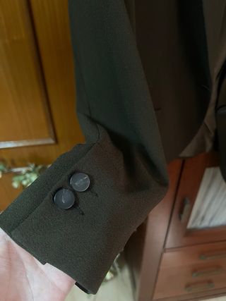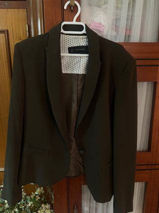Americana de Zara con hombreras Blazer corta forrada por dentro con botones originales. Tiene hombreras que hace una forma muy bonita. Es corta, llega por la cintura, y color como se ve en la foto color caqui/ verde militar. Nueva. Tiene un corte clásico y elegante. Marca Zara
