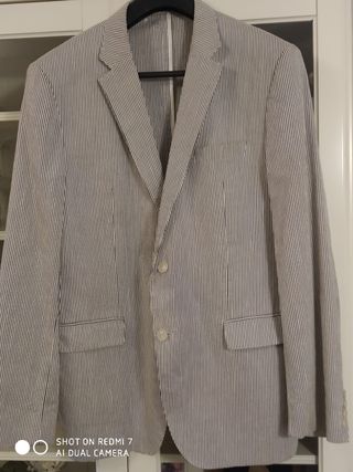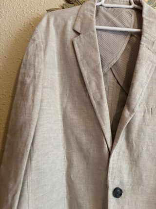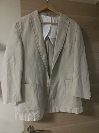 Vendo americana para hombre de Massimo Dutti con funda porta traje, color beige, cierre con 3 botones, con 3 bolsillos exteriores y 4 interiores, con aberturas laterales de 23cm. Talla 44, medidas: largo 78cm, ancho espalda 44cm, largo manga 65cm. Composición: exterior: 100% algodón. forro: 100% viscosa. Ligera y muy versátil para combinar con chinos o vaqueros. Ideal para temporadas de entretiempo como primavera o verano. En perfecto estado.