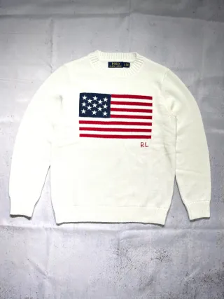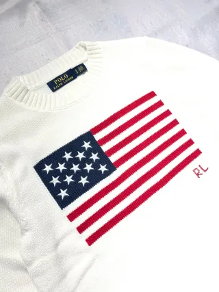 Este suéter de Polo Ralph Lauren presenta un diseño clásico de bandera americana. - Tejido de punto. - Detalle de bandera bordada en el pecho. - Acabado en cuello, puños y bajo acanalados.