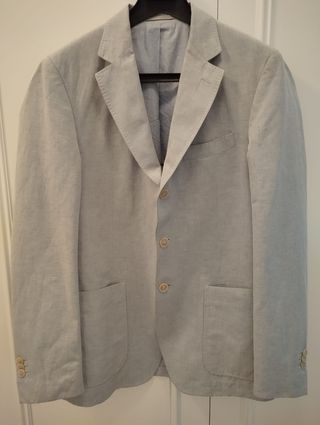 Vendo americana para hombre de Massimo Dutti en tono azul claro, cierre con 3 botones, con 3 bolsillos exteriores y 3 interiores, con una abertura trasera de 26cm. Talla 48, medidas: largo 76cm, ancho espalda 44cm, largo manga 70cm. Composición: exterior 50% lino, 50% algodón. Forro: 100% algodón. Ligera y muy versátil para combinar con chinos o vaqueros. Ideal para temporadas de entretiempo como primavera o verano. En perfecto estado.