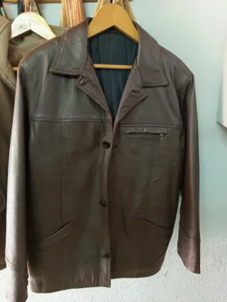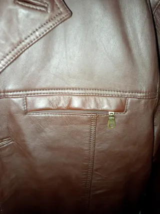 Americana de piel en color marrón. - Cierre de botones. - Bolsillo con cremallera en el pecho. - Bolsillos frontales. - Cuello solapa.