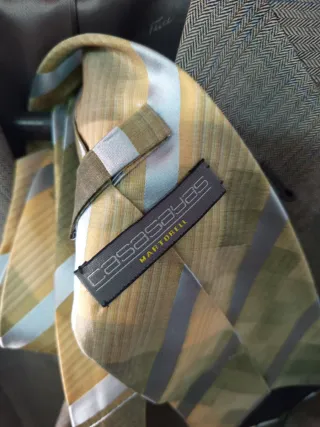 Americana de vestir con corbata a juego. - Americana de tejido con patrón de espiga. - Corbata con diseño a cuadros en tonos verdes y amarillos.
