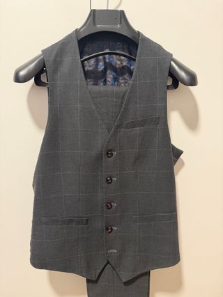 Conjunto de tres piezas para hombre. Traje elegante y formal, ideal para bodas y eventos especiales. Incluye: americana, chaleco, pantalones, y como elementos decorativos un pin de una libélula y un pañuelo. Chaqueta → M / 48 Chaleco → M / 48 Pantalón → M / 29