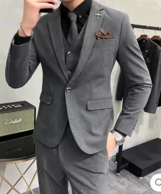 Conjunto de tres piezas para hombre. Traje elegante y formal, ideal para bodas y eventos especiales. Incluye: americana, chaleco, pantalones, y como elementos decorativos un pin de una libélula y un pañuelo. Chaqueta → XXXL / 56 Chaleco → XXXL/ 56 Pantalón → XXXL / 34