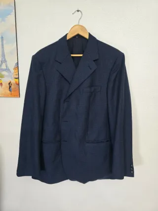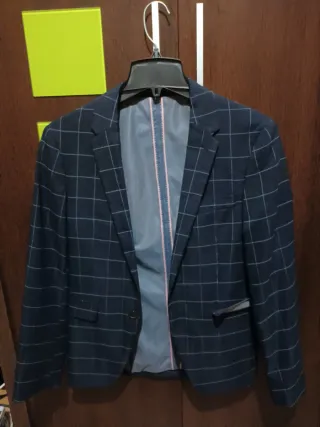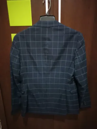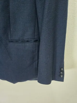 Americana de vestir en color azul, talla 50. Solo se ha usado en una ocasión. - Diseño con microestampado. - Forro interior a cuadros. - Cierre de dos botones. - Bolsillos de solapa en la parte delantera.