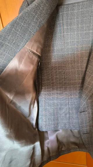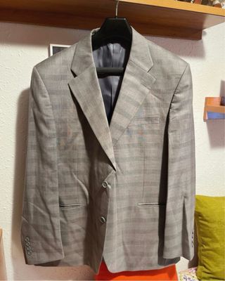 Chaqueta de vestir para hombre con un diseño de cuadros sutil. Está en muy buen estado, pero tiene un pequeño rasgado en la parte interna de una manga, tal y como puede verse en una de las fotos. - Cierre de dos botones. - Bolsillos frontales con solapa.