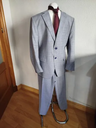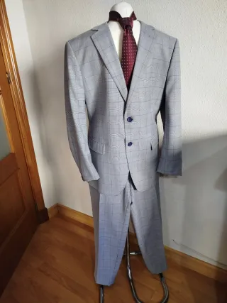 Elegante traje de hombre con un discreto estampado a cuadros. - Chaqueta de corte clásico. - Pantalón a juego. - Diseño versátil para diferentes ocasiones. TALLA CHAQUETA: 54 TALLA PANTALÓN: 48