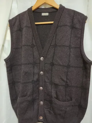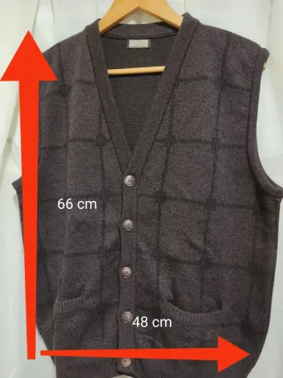 Chaleco de punto para hombre con un diseño de cuadros sutil. Es una prenda cómoda y versátil. - Cuello en V. - Cierre de botones. - Dos bolsillos delanteros. - Medida en cm en la foto.