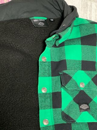 Chaqueta con capucha de cuadros en verde y negro. - Diseño a cuadros. - Capucha integrada. - Cierre de botones a presión. - Dos bolsillos en el pecho con solapa. - Bolsillos laterales - Interior de Borrego - Talla L Americana XL Europea