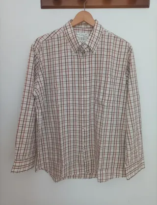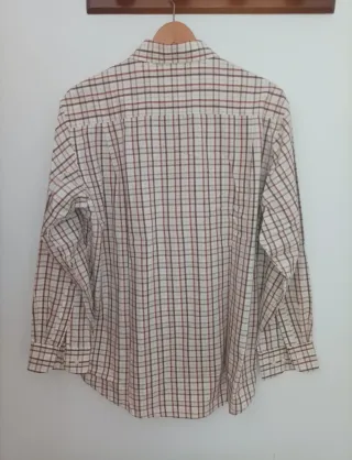 Perfecta para amantes del estilo campero, smart-casual o para quienes aprecian la camisería de autor. Diseño exclusivo de Paul E. Esther con un estampado de cuadros en tonos tierra sobre fondo blanco. Cuello: Estilo button-down (con botones), ideal para mantener la forma con o sin chaqueta. Corte: Patrón amplio y cómodo, que permite una gran libertad de movimiento. Queda increíble tanto en un look formal con americana como en uno más relajado con vaqueros o pantalones tipo chino. Medidas exactas: Sisa (axila a axila): 64 cm Largo total: 78 cm Talla: 4 (Equivale a una XL o cuello 42-43).