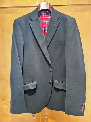Americana de vestir El Ganso. - Color exterior negro. - Forro interior a cuadros en rojo y negro. - Detalle de pespunte en la solapa. - Puños con botones.
