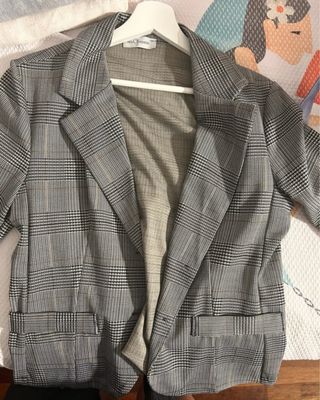 Elegante americana de cuadros en color gris. - Diseño clásico y sofisticado. - Tejido de calidad, muy suave al tacto. - Un botón frontal. - Dos bolsillos delanteros. - En perfecto estado