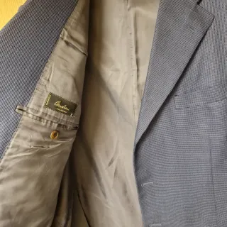 Elegante blazer de Brooks Brothers, una prenda clásica y muy bien construida. Forma parte de un traje en el que se rompió el pantalón. Características: - Corte regular. - Azul marino. - Estampado cuadros muy sutil. - Talla EU 48.