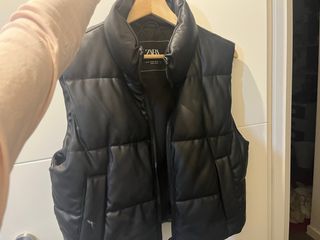 Chaleco acolchado de Zara con acabado efecto piel. - Diseño sin mangas. - Cierre de cremallera frontal. - Cuello alto.