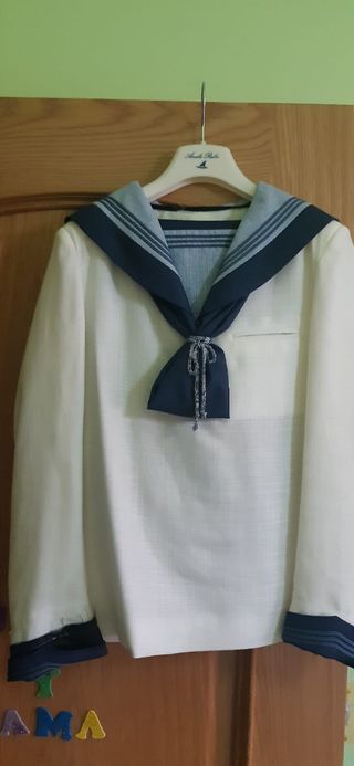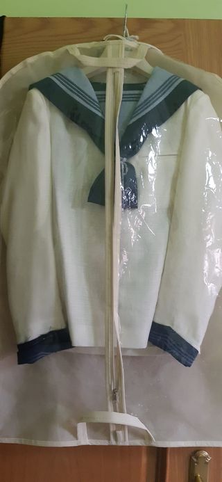 Traje de Comunión de marinero complementamente nuevo de lino con pantalón azul marino y zapatos a juego tela de ante azul marino piel de melocoton. Valorado el conjunto y los zapatos en más de 500 euros.