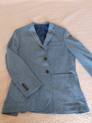 Americana marca Dustin de la talla 50. Corte regular, no es muy entallada. Color gris azulado, perfecta para primavera verano. Se ha llevado bastante, pero está bien todavia