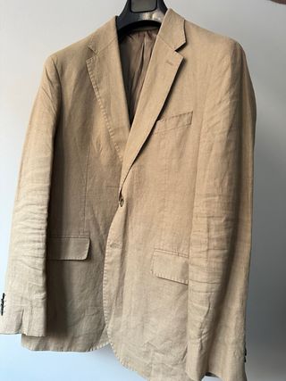 Americana ligera y fresca (primavera verano) de corte clásico en color beige. - Cierre de dos botones. - Dos bolsillos frontales con solapa. - Un bolsillo en el pecho. Poco uso. Talla 58.