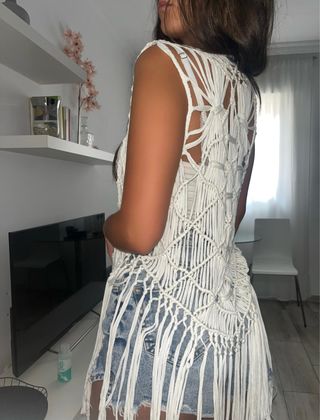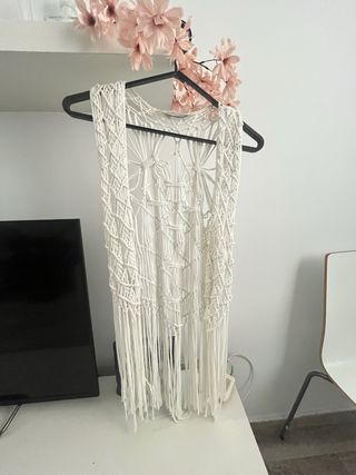 Precioso chaleco de ganchillo en color blanco. Es una prenda perfecta para darle un toque a tu look. - Diseño de red con flecos. - Ideal para verano. -Talla S.