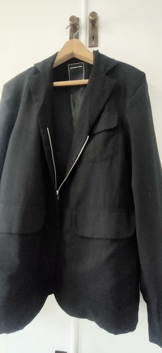 Americana de la marca Colcci de diseño moderno en color negro. Talla M/L (medidas: 45cm hombros, 50cm sisa y 73cm largo), 100% poliéster, 3 bolsillos delanteros, forro interior fino, cierre con cremallera frontal y detalle de cremallera en los puños, letras Boxing Club en parte superior espalda. Poco usada y en perfectas condiciones.