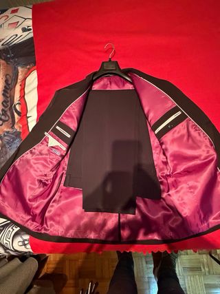 Elegante traje de hombre en color negro. Perfecto para eventos formales o de negocios. - Chaqueta con solapa de muesca. - Bolsillo de ribete en el pecho. - Cierre de dos botones. - Forro interior de color vibrante. 1 uso cada uno 60€ la unidad 150€ los 3