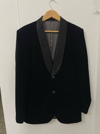 Chaqueta de smoking negra con corte entallado. - Solapa de satén. - Cierre de un botón. - Puños con botones. me costó 89.99€ solo usada un par de horas,como nueva.