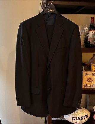 Elegante traje de dos piezas de la marca JOHN HOLDEN como nuevo lo he usado menos de 5 veces, lo vendo porque ya no me entra. Es una marca internacional de fuera, con calidad premium, muestro la factura de compra, y lo entrego con su cobertor - Chaqueta de corte clásico. - Pantalón a juego.