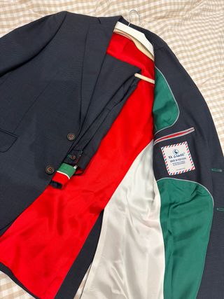 Conjunto de traje de dos piezas de El Ganso, compuesto por americana y pantalón. - Americana con forro interior de color rojo vivo. - Pantalón a juego con la americana. - Detalle de pespuntes verdes en la solapa y botones.
