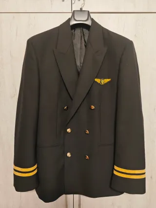 Chaqueta de piloto de Ryanair, ideal para uniformes o coleccionistas. Tallaje 39. - Diseño de doble botonadura. - Insignia dorada con alas en la solapa. - Puños con detalles dorados.