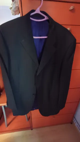 Traje de chaqueta negro con botones. -Chaqueta talla 40L -Pantalón 36/30 cogido para hombre de 1,75 - Solapa de muesca. - Bolsillos de solapa. - Bolsillo de ribete en el pecho. -La chaqueta tiene un pequeño quemazo