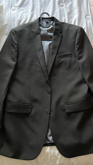 Traje de dos piezas para caballero en color negro, pantalón y blazer. Modelo slim fit. - Blazer con cierre de dos botones y dos aberturas traseras. Falsos bolsillos con solapa. Talla 44 equivalente a una talla M. - Pantalón talla 36. Bolsillos laterales, y trasero. Cierre cremallera y botón. Trabillas en cintura. En perfecto estado, compra en Diciembre de 2024 y utilizado sólo dos veces. Precio en tienda 105€.