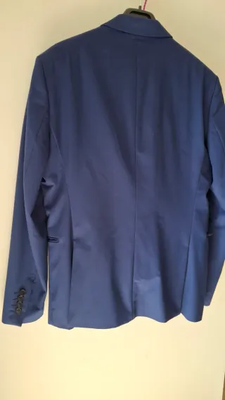 Traje de dos piezas en tono azul. - Chaqueta con solapa de muesca. Talla 46 en etiqueta (aunque equivale a una M) - Cierre de dos botones en la chaqueta. - Bolsillo de ribete en el pecho con pañuelo blanco. - Bolsillos de solapa en la parte delantera de la chaqueta. - Pantalón a juego. TALLA 38