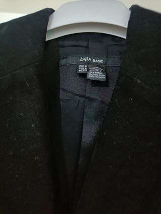 Elegante chaqueta blazer de Zara en azul marino, talla 21. Está en buen estado. Tiene algunas bolitas en la parte inferior derecha (ver última foto) - Tejido de calidad. - Corte clásico y favorecedor. - Ideal para ocasiones formales e informales