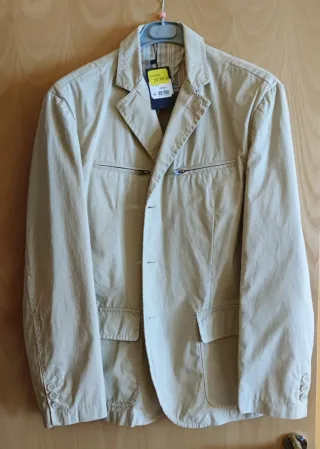 Americana ligera de color beige para hombre. - Cierre de botones. - Dos bolsillos inferiores. - Dos bolsillos superiores con cremallera. - Puños con botones. Está nueva con etiqueta (precio original 39,99 €).