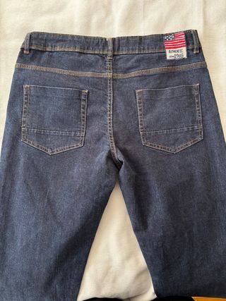 Vaquero clásico de la marca BROTES. - Diseño de cinco bolsillos. - Cierre de botón y cremallera. - Costuras en contraste. Vaqueros comprados en El Corte Inglés. Buena calidad. Marca BROTES. Vaquero azul oscuro. Pespuntes en contraste veis. Detalle bandera americana. Con goma y botones en la cintura para ajustar el ancho de la cintura. Medida cintura aproximado 41-42 cms (contorno 82 cms) y largo 105 cm. 99% algodón 1% elastano. Vaqueros recto talla joven 16 años. Sería una talla 40 de adulto. No sé si usados 1 vez. Mira más cosas en mi perfil. Haz un lote y te hago descuento. PRECIO YA AJUSTADO