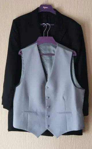 Conjunto de chaqué de tres piezas. Incluye americana y chaleco. - Chaqué de 3 piezas. - Americana negra. - Chaleco gris.