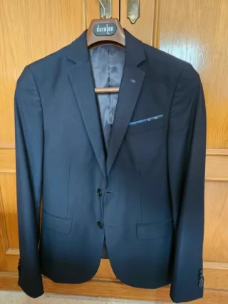 Elegante traje de dos piezas para hombre de Tz Fabricantes con solo un uso. - Chaqueta con solapa de muesca. - Cierre de botón en la chaqueta. - Dos bolsillos frontales con solapa en la chaqueta. - Puños con botones. - Pantalón a juego. Se vende como nuevo, solo ha sido usado en una boda. Precio original 110€