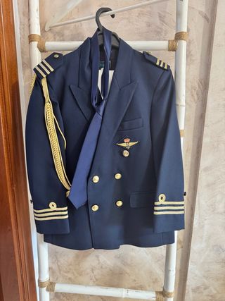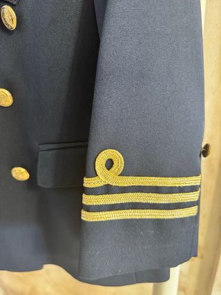 Conjunto de traje para comunión de niño. Talla 14 - Chaqueta azul marino con doble abotonadura dorada. - Hombreras con detalles dorados. - Puños de manga con galones dorados. - Escudo bordado en la solapa. - Corbata azul a juego. - Cordón dorado decorativo en el hombro. - Pantalon blanco y corbata azul marino.