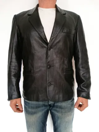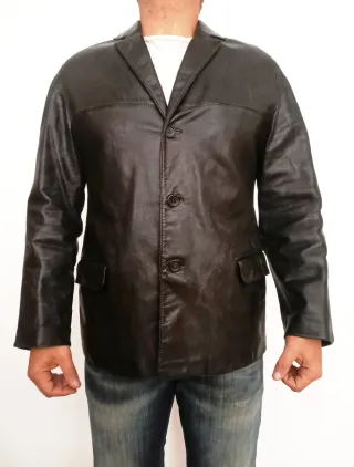 Más prendas de cuero en mi perfil. Chaqueta americana de cuero. Marca de prestigio. Fabricada en Francia, garantía de calidad Años 80. Usada, pero el cuero está en buen estado, sin defectos, ni roturas. Solamente señales de uso intensivo. El botón superior no es el original.. Cuero ovino de excelente calidad, flexible y suave. Tacto blando. Grosor medio-fino. Textura de grano fino. Color negro intenso y brillante. Hombreras ligeramente acolchadas. Fila de botones en los puños. La etiqueta indica talla XXL, pero es más próxima a la XL. El modelo mide 1,74 y pesa 80 kgs. Medidas indicadas en las fotos. Preguntar cualquier informació