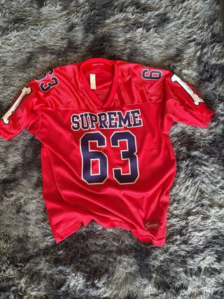 Camiseta de fútbol americano Supreme de color rojo, con número 63 en la parte delantera y detalles en forma de hueso en las mangas. Logo Supreme en el pecho. Número 63 en azul marino con borde blanco. Detalles en forma de hueso en los hombros.
